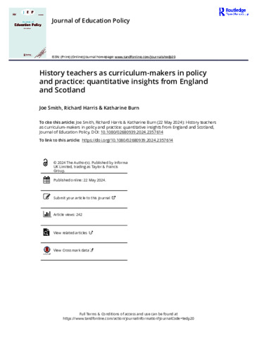Smith, J., Harris, R. orcid id iconORCID: https://orcid.org/0000-0001-8606-5515 and Burn, K. (2024) History teachers as curriculum-makers in policy and practice: quantitative insights from England and Scotland. Journal of Education Policy. ISSN 1464-5106 doi: 10.1080/02680939.2024.2357614