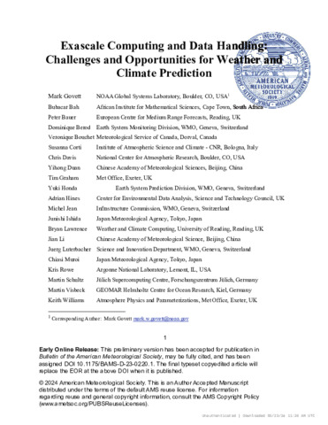 Govett, M., Bah, B., Bauer, P., Berod, D., Bouchet, V., Corti, S., Davis, C., Duan, Y., Graham, T., Honda, Y., Hines, A., Jean, M., Ishida, J., Lawrence, B. orcid id iconORCID: https://orcid.org/0000-0001-9262-7860, Li, J., Luterbacher, J., Muroi, C., Rowe, K., Schultz, M., Visbeck, M. and Williams, K. (2024) Exascale computing and data handling: challenges and opportunities for weather and climate prediction. Bulletin of the American Meteorological Society, 105 (12). E2385-E2404. ISSN 0003-0007 doi: 10.1175/BAMS-D-23-0220.1
