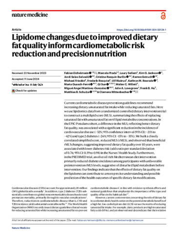 Eichelmann, F., Prada, M., Sellem, L., Jackson, K. G. orcid id iconORCID: https://orcid.org/0000-0002-0070-3203, Salas Salvadó,, J., Razquin Burillo, C., Estruch, R., Friedén,, M., Rosqvist, F., Risérus, U., Rexrode, K. M., Guasch-Ferré, M., Sun, Q., Willett, W. C., Martinez-Gonzalez, M. A., Lovegrove, J. A. orcid id iconORCID: https://orcid.org/0000-0001-7633-9455, Hu, F. B., Schulze, M. B. and Wittenbecher, C. (2024) Lipidome changes due to improved dietary fat quality inform cardiometabolic risk reduction and precision nutrition. Nature Medicine. ISSN 1078-8956 doi: 10.1038/s41591-024-03124-1