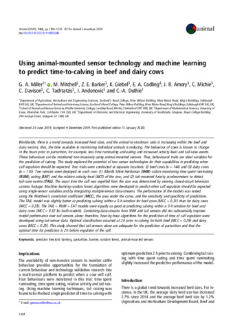 Miller, G.A. orcid id iconORCID: https://orcid.org/0000-0001-7810-9987, Mitchell, M., Barker, Z. E. orcid id iconORCID: https://orcid.org/0000-0002-8512-0831, Giebel, K., Codling, E.A., Amory, J.R., Michie, C., Davison, C., Tachtatzis, C., Andonovic, I. and Duthie, C.-A. (2020) Using animal-mounted sensor technology and machine learning to predict time-to-calving in beef and dairy cows. Animal, 14 (6). pp. 1304-1312. ISSN 1751-732X doi: 10.1017/S1751731119003380