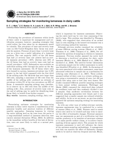 Main, D.C.J., Barker, Z. E. orcid id iconORCID: https://orcid.org/0000-0002-8512-0831, Leach, K.A., Bell, N.J., Whay, H.R. and Browne, W.J. (2010) Sampling strategies for monitoring lameness in dairy cattle. Journal of Dairy Science, 93 (5). pp. 1970-1978. ISSN 1525-3198 doi: 10.3168/jds.2009-2500