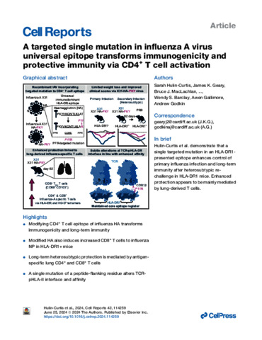 Hulin-Curtis, S., Geary, J. K., MacLachlan, B. J., Altmann, D. M., Baillon, L., Cole, D. K., Greenshields-Watson, A., Hesketh, S. J., Humphreys, I. R., Jones, I. M. orcid id iconORCID: https://orcid.org/0000-0002-7738-2516, Lauder, S. N., Mason, G. H., Smart, K., Scourfield, D. O., Scott, J., Sukhova, K., Stanton, R. J., Wall, A., Rizkallah, P. J., Barclay, W. S., Gallimore, A. and Godkin, A. orcid id iconORCID: https://orcid.org/0000-0002-1910-7567 (2024) A targeted single mutation in influenza A virus universal epitope transforms immunogenicity and protective immunity via CD4+ T cell activation. Cell Reports, 43 (6). 114259. ISSN 22111247 doi: 10.1016/j.celrep.2024.114259