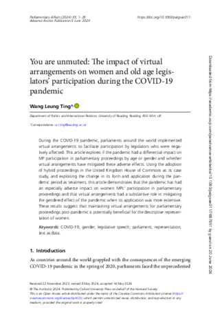 Ting, W. L. orcid id iconORCID: https://orcid.org/0000-0002-0101-1532 (2024) You are unmuted: the impact of virtual arrangements on women and old age legislators’ participation during the COVID-19 pandemic. Parliamentary Affairs. ISSN 1460-2482 doi: 10.1093/pa/gsae011
