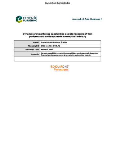Cataltepe, V., Kamasak, R. orcid id iconORCID: https://orcid.org/0000-0001-8768-3569, Bulutlar, F. and Palalar Alkan, D. (2023) Dynamic and marketing capabilities as determinants of firm performance: evidence from automotive industry. Journal of Asia Business Studies, 17 (3). pp. 617-638. ISSN 1558-7894 doi: 10.1108/JABS-11-2021-0475