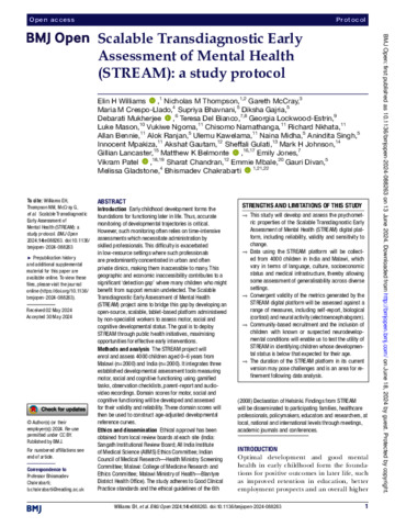 Introduction Early childhood development forms the foundations for functioning later in life. Thus, accurate monitoring of developmental trajectories is critical. However, such monitoring often relies on time-intensive assessments which necessitate administration by skilled professionals. This difficulty is exacerbated in low-resource settings where such professionals are predominantly concentrated in urban and often private clinics, making them inaccessible to many. This geographic and economic inaccessibility contributes to a significant ‘detection gap’ where many children who might benefit from support remain undetected. The Scalable Transdiagnostic Early Assessment of Mental Health (STREAM) project aims to bridge this gap by developing an open-source, scalable, tablet-based platform administered by non-specialist workers to assess motor, social and cognitive developmental status. The goal is to deploy STREAM through public health initiatives, maximising opportunities for effective early interventions. Methods and analysis The STREAM project will enrol and assess 4000 children aged 0–6 years from Malawi (n=2000) and India (n=2000). It integrates three established developmental assessment tools measuring motor, social and cognitive functioning using gamified tasks, observation checklists, parent-report and audio-video recordings. Domain scores for motor, social and cognitive functioning will be developed and assessed for their validity and reliability. These domain scores will then be used to construct age-adjusted developmental reference curves. Ethics and dissemination Ethical approval has been obtained from local review boards at each site (India: Sangath Institutional Review Board; All India Institute of Medical Science (AIIMS) Ethics Committee; Indian Council of Medical Research—Health Ministry Screening Committee; Malawi: College of Medicine Research and Ethics Committee; Malawi Ministry of Health—Blantyre District Health Office). The study adheres to Good Clinical Practice standards and the ethical guidelines of the 6th (2008) Declaration of Helsinki. Findings from STREAM will be disseminated to participating families, healthcare professionals, policymakers, educators and researchers, at local, national and international levels through meetings, academic journals and conferences.