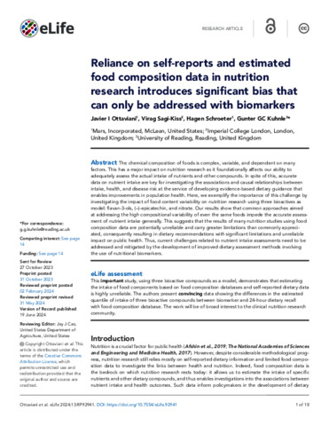 Ottaviani, J. I. orcid id iconORCID: https://orcid.org/0000-0002-4909-0452, Sagi-Kiss, V. orcid id iconORCID: https://orcid.org/0000-0003-3959-6596, Schroeter, H. orcid id iconORCID: https://orcid.org/0000-0001-6569-382X and Kuhnle, G. G. C. orcid id iconORCID: https://orcid.org/0000-0002-8081-8931 (2024) Reliance on self-reports and estimated food composition data in nutrition research introduces significant bias that can only be addressed with biomarkers. eLIFE, 13. RP92941. ISSN 2050-084X doi: 10.7554/eLife.92941.3