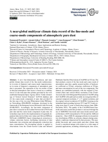 A new four-dimensional, multiyear, and near-global climate data record of the fine-mode (submicrometer in terms of diameter) and coarse-mode (supermicrometer in terms of diameter) components of atmospheric pure dust is presented. The separation of the two modes of dust in detected atmospheric dust layers is based on a combination of (1) the total pure-dust product provided by the well-established European Space Agency (ESA) “LIdar climatology of Vertical Aerosol Structure” (LIVAS) database and (2) the coarse-mode component of pure dust provided by the first step of the two-step POlarization LIdar PHOtometer Networking (POLIPHON) technique, developed in the framework of the European Aerosol Research Lidar Network (EARLINET). Accordingly, the fine-mode component of pure dust is extracted as the residual between the LIVAS total pure dust and the coarse-mode component of pure dust. Intermediate steps involve the implementation of regionally dependent lidar-derived lidar ratio values and AErosol RObotic NETwork (AERONET)-based climatological extinction-to-volume conversion factors, facilitating conversion of dust backscatter into extinction and subsequently extinction into mass concentration. The decoupling scheme is applied to observations from the Cloud–Aerosol Lidar and Infrared Pathfinder Satellite Observations (CALIPSO) at 532 nm. The final products consist of the fine mode and coarse mode of atmospheric pure dust, quality-assured profiles of backscatter coefficient at 532 nm, extinction coefficient at 532 nm, and mass concentration for each of the two components. The datasets are established primarily with the original L2 horizontal (5 km) and vertical (60 m) resolution of the Cloud–Aerosol Lidar with Orthogonal Polarization (CALIOP) along the CALIPSO orbit path and secondly in averaged profiles of seasonal–temporal resolution, 1° × 1° spatial resolution, and the original vertical resolution of CALIPSO, focusing on the latitudinal band extending between 70° S and 70° N and covering more than 15 years of Earth observations (June 2006–December 2021). The quality of the CALIPSO-based fine-mode and coarse-mode dust products is assessed through the use of AERONET fine-mode and coarse-mode aerosol optical thickness (AOT) interpolated to 532 nm and the AERosol properties – Dust (AER-D) campaign airborne in situ particle size distributions (PSDs) as reference datasets during atmospheric conditions characterized by dust presence. The near-global fine-mode and coarse-mode pure-dust climate data record is considered unique with respect to a wide range of potential applications, including climatological, time series, and trend analysis over extensive geographical domains and temporal periods, validation of atmospheric dust models and reanalysis datasets, assimilation activities, and investigation of the role of airborne dust in radiation and air quality.