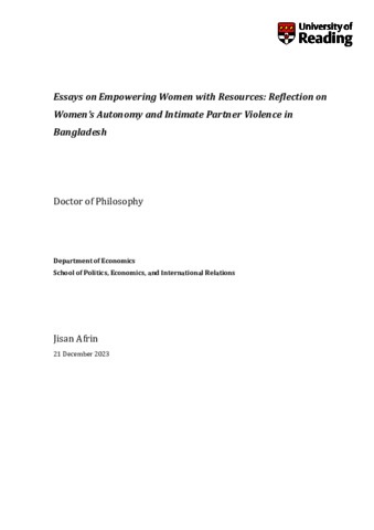 Afrin, J. (2024) Essays on empowering women with resources: reflection on women’s autonomy and intimate partner violence in Bangladesh. PhD thesis, University of Reading. doi: 10.48683/1926.00116953