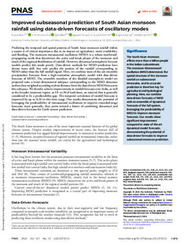 Bach, E. orcid id iconORCID: https://orcid.org/0000-0002-9725-0203, Krishnamurthy, V., Mote, S., Shukla, J., Surjalal Sharma, A., Kalnay, E. and Ghil, M. (2024) Improved subseasonal prediction of South Asian monsoon rainfall using data-driven forecasts of oscillatory modes. Proceedings of the National Academy of Sciences of the United States of America, 121 (15). e2312573121. ISSN 1091-6490 doi: 10.1073/pnas.2312573121