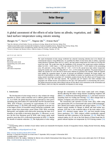 Xu, Z., Li, Y., Qin, Y. and Bach, E. orcid id iconORCID: https://orcid.org/0000-0002-9725-0203 (2024) A global assessment of the effects of solar farms on albedo, vegetation, and land surface temperature using remote sensing. Solar Energy, 268. 112198. ISSN 1471-1257 doi: 10.1016/j.solener.2023.112198