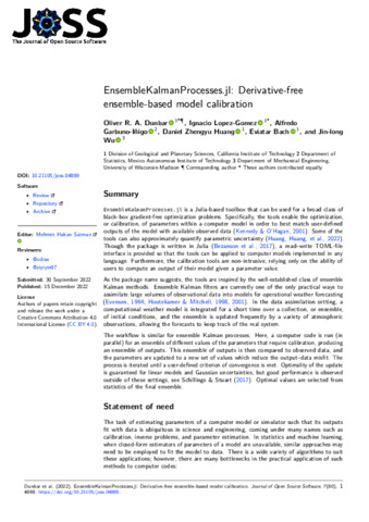 Dunbar, O. R. A., Lopez-Gomez, I., Garbuno-Iñigo, A., Zhengyu Huang, D., Bach, E. orcid id iconORCID: https://orcid.org/0000-0002-9725-0203 and Wu, J.-l. (2022) EnsembleKalmanProcesses.jl: derivative-free ensemble-based model calibration. Journal of Open Source Software, 7 (80). 4869. ISSN 2475-9066 doi: 10.21105/joss.04869
