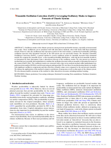 Bach, E. orcid id iconORCID: https://orcid.org/0000-0002-9725-0203, Mote, S., Krishnamurthy, V., Surjalal Sharma, A., Ghil, M. and Kalnay, E. (2021) Ensemble Oscillation Correction (EnOC): leveraging oscillatory modes to improve forecasts of chaotic systems. Journal of Climate, 34 (14). pp. 5673-5686. ISSN 1520-0442 doi: 10.1175/jcli-d-20-0624.1