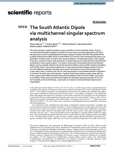 Manta, G., Bach, E. orcid id iconORCID: https://orcid.org/0000-0002-9725-0203, Talento, S., Barreiro, M., Speich, S. and Ghil, M. (2024) The South Atlantic Dipole via multichannel singular spectrum analysis. Scientific Reports, 14. 15534. ISSN 2045-2322 doi: 10.1038/s41598-024-62089-w