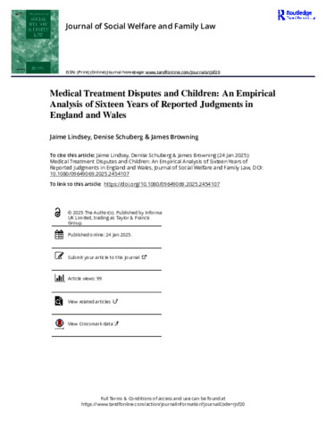 Lindsey, J., Schuberg, D. and Browning, J. (2025) Medical treatment disputes and children: an empirical analysis of sixteen years of reported judgments in England and Wales. Journal of Social Welfare and Family Law. ISSN 1469-9621 doi: 10.1080/09649069.2025.2454107