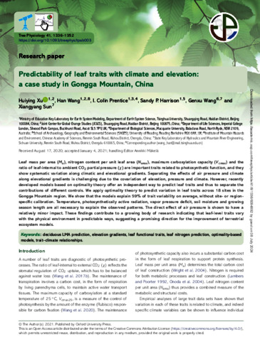 Leaf mass per area (Ma), nitrogen content per unit leaf area (Narea), maximum carboxylation capacity (Vcmax) and the ratio of leaf-internal to ambient CO2 partial pressure (χ) are important traits related to photosynthetic function, and they show systematic variation along climatic and elevational gradients. Separating the effects of air pressure and climate along elevational gradients is challenging due to the covariation of elevation, pressure and climate. However, recently developed models based on optimality theory offer an independent way to predict leaf traits and thus to separate the contributions of different controls. We apply optimality theory to predict variation in leaf traits across 18 sites in the Gongga Mountain region. We show that the models explain 59% of trait variability on average, without site- or region-specific calibration. Temperature, photosynthetically active radiation, vapor pressure deficit, soil moisture and growing season length are all necessary to explain the observed patterns. The direct effect of air pressure is shown to have a relatively minor impact. These findings contribute to a growing body of research indicating that leaf-level traits vary with the physical environment in predictable ways, suggesting a promising direction for the improvement of terrestrial ecosystem models.