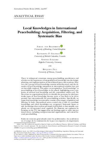 There is widespread consensus among peacebuilding practitioners and scholars on the importance of integrating local knowledge into the design, planning, and implementation of international peace interventions. However, the concept of local knowledge remains undertheorized and the dynamics of local knowledge integration in international activities have not yet been fully explored. This paper reconceptualizes “local knowledge” in peacebuilding as local knowledges in the plural, highlighting seven categories of relevant local knowledge and the contestation within each. We then draw on organizational theory to identify the processes by which particular types of local knowledge become more or less likely to be incorporated into internationally-led peacebuilding activities. Specifically, we argue that knowledge incorporation consists of two stages: acquisition and filtering. In both, international actors control who is able to contribute knowledges and which knowledges are recognized. Systematic biases result: knowledges that confirm previously held beliefs or that simplify complexity are incorporated more regularly. We illustrate our argument by focusing on the UN, but suggest that our findings apply to other international actors, including non-governmental organizations, and extend beyond peacebuilding.