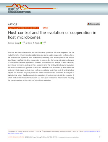 Humans, and many other species, are host to diverse symbionts. It is often suggested that the mutual benefits of host-microbe relationships can alone explain cooperative evolution. Here, we evaluate this hypothesis with evolutionary modelling. Our model predicts that mutual benefits are insufficient to drive cooperation in systems like the human microbiome, because of competition between symbionts. However, cooperation can emerge if hosts can exert control over symbionts, so long as there are constraints that limit symbiont counter evolution. We test our model with genomic data of two bacterial traits monitored by animal immune systems. In both cases, bacteria have evolved as predicted under host control, tending to lose flagella and maintain butyrate production when host-associated. Moreover, an analysis of bacteria that retain flagella supports the evolution of host control, via toll-like receptor 5, which limits symbiont counter evolution. Our work puts host control mechanisms, including the immune system, at the centre of microbiome evolution.