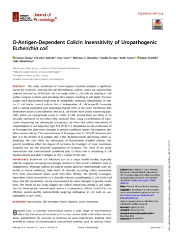 Sharp, C. orcid id iconORCID: https://orcid.org/0000-0002-9424-3622, Boinett, C., Cain, A., Housden, N. G., Kumar, S., Turner, K., Parkhill, J. and Kleanthous, C. (2019) O-antigen-dependent colicin insensitivity of uropathogenic Escherichia coli. Journal of bacteriology, 201 (4). ISSN 1098-5530 doi: 10.1128/JB.00545-18