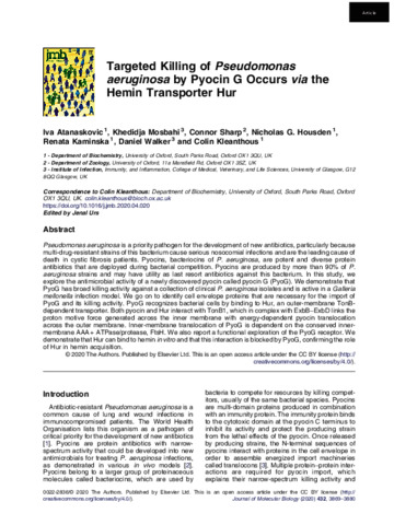 Atanaskovic, I., Mosbahi, K., Sharp, C. orcid id iconORCID: https://orcid.org/0000-0002-9424-3622, Housden, N. G., Kaminska, R., Walker, D. and Kleanthous, C. (2020) Targeted killing of Pseudomonas aeruginosa by Pyocin G Occurs via the Hemin Transporter Hur. Journal of Molecular Biology, 432 (13). pp. 3869-3880. ISSN 1089-8638 doi: 10.1016/j.jmb.2020.04.020