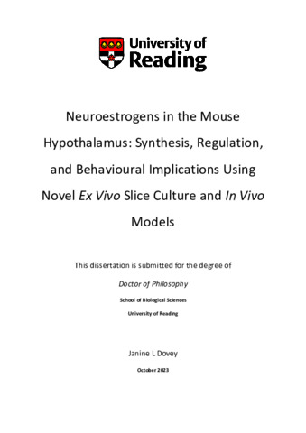 Dovey, J. L. (2024) Neuroestrogens in the mouse hypothalamus: synthesis, regulation, and behavioural implications using novel ex vivo slice culture and in vivo models. PhD thesis, University of Reading. doi: 10.48683/1926.00117310