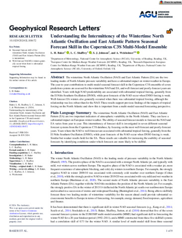 Baker, L. H. orcid id iconORCID: https://orcid.org/0000-0003-0738-9488, Shaffrey, L. C. orcid id iconORCID: https://orcid.org/0000-0003-2696-752X, Johnson, S. J. and Weisheimer, A. (2024) Understanding the intermittency of the wintertime North Atlantic Oscillation and East Atlantic Pattern seasonal forecast skill in the Copernicus C3S multi-model ensemble. Geophysical Research Letters, 51 (15). e2024GL108472. ISSN 1944-8007 doi: 10.1029/2024GL108472