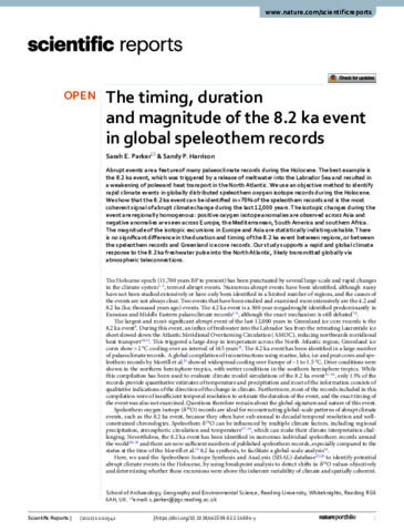 Parker, S. E. and Harrison, S. P. orcid id iconORCID: https://orcid.org/0000-0001-5687-1903 (2022) The timing, duration and magnitude of the 8.2 ka event in global speleothem records. Scientific Reports, 12. 10542. ISSN 2045-2322 doi: 10.1038/s41598-022-14684-y