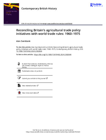 Swinbank, A. orcid id iconORCID: https://orcid.org/0000-0003-2526-2026 (2024) Reconciling Britain’s agricultural trade policy initiatives with world trade rules: 1960–1975. Contemporary British History. ISSN 1743-7997 doi: 10.1080/13619462.2024.2382864