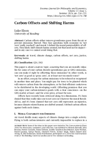 Elson, L. orcid id iconORCID: https://orcid.org/0000-0002-3013-8030 (2024) Carbon offsets and shifting harms. Erasmus Journal for Philosophy and Economics, 17 (1). pp. 234-255. ISSN 1876-9098 doi: 10.23941/ejpe.v17i1.790