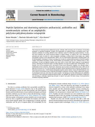 Peptide lipidation and shortening optimises antibacterial, antibiofilm and membranolytic actions of an amphiphilic polylysine-polyphenyalanine octapeptide.