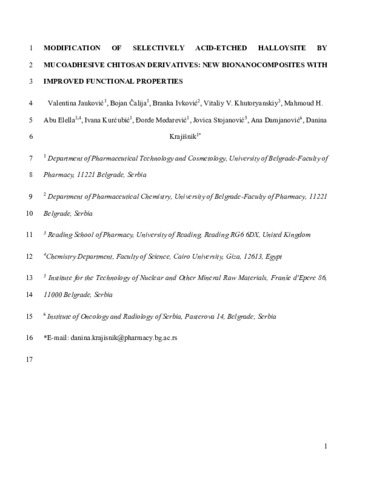 Modification of selectively acid-etched halloysite by mucoadhesive chitosan derivatives: new bionanocomposites with improved functional properties.