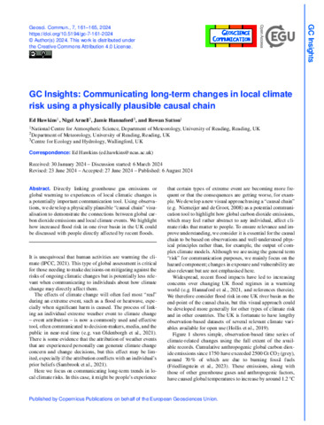 Hawkins, E. orcid id iconORCID: https://orcid.org/0000-0001-9477-3677, Arnell, N. orcid id iconORCID: https://orcid.org/0000-0003-2691-4436, Hannaford, J. orcid id iconORCID: https://orcid.org/0000-0002-5256-3310 and Sutton, R. orcid id iconORCID: https://orcid.org/0000-0001-8345-8583 (2024) GC insights: communicating long-term changes in local climate risk using a physically plausible causal chain. Geoscience Communication, 7 (3). pp. 161-165. ISSN 2569-7110 doi: 10.5194/gc-7-161-2024