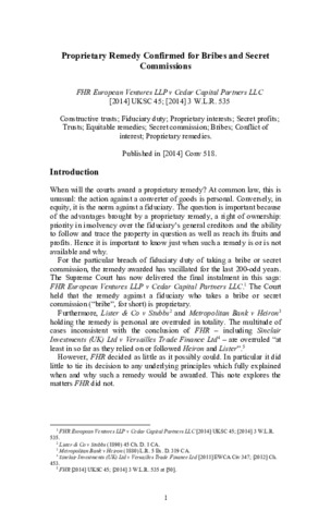Comments on the Supreme Court ruling in FHR European Ventures LLP v Cedar Capital Partners LLC on whether a principal's remedy against a fiduciary who accepts a secret commission or bribe in breach of fiduciary duty, is proprietary. Reviews key features of the ruling, the position of personal disgorgement claims, and the issues not decided by the court, including the theoretical justifications for creating a property right. Explains the need for further litigation to clarify unresolved matters.