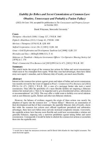Additional Information Unmapped bibliographic data: ST - Liability for Bribes and Secret Commissions at Common Law: Obsolete, Unnecessary and Probably a Fusion Fallacy [Field not mapped to EPrints] L1 - internal-pdf://0389666063/Whayman - BaSC at Common Law (2022) 86 Conv 18.pdf [Field not mapped to EPrints]