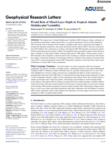 Senapati, B. orcid id iconORCID: https://orcid.org/0000-0001-5029-9731, O'Reilly, C. H. orcid id iconORCID: https://orcid.org/0000-0002-8630-1650 and Robson, J. orcid id iconORCID: https://orcid.org/0000-0002-3467-018X (2024) Pivotal role of mixed-layer depth in Tropical Atlantic Multidecadal Variability. Geophysical Research Letters, 51 (15). e2024GL110057. ISSN 1944-8007 doi: 10.1029/2024GL110057