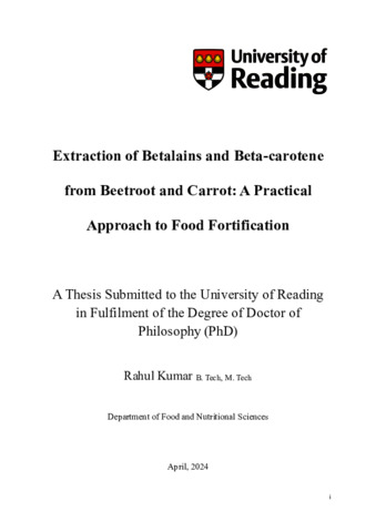 Kumar, R. (2024) Extraction of Betalains and Beta-carotene from beetroot and carrot: a practical approach to food fortification. PhD thesis, University of Reading. doi: 10.48683/1926.00117653