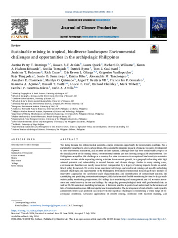 Domingo, J. P. T. orcid id iconORCID: https://orcid.org/0000-0002-9746-4930, Jenkin, G. R.T. orcid id iconORCID: https://orcid.org/0000-0001-9202-7128, Quick, L., Williams, R. D. orcid id iconORCID: https://orcid.org/0000-0001-6067-1947, Hudson-Edwards, K. A. orcid id iconORCID: https://orcid.org/0000-0003-3965-2658, Tortajada, C. orcid id iconORCID: https://orcid.org/0000-0001-6308-4924, Byrne, P., Coulthard, T. J., Padrones, J. T., Crane, R. orcid id iconORCID: https://orcid.org/0000-0003-0117-2245, Gibaga, C. R. L. orcid id iconORCID: https://orcid.org/0000-0001-7906-7993, Vasilopoulos, G. orcid id iconORCID: https://orcid.org/0000-0003-1519-3442, Tungpalan, K., Samaniego, J. O., Biles, E. orcid id iconORCID: https://orcid.org/0000-0002-7380-1250, Tanciongco, A. M., Chambers, J. E. orcid id iconORCID: https://orcid.org/0000-0002-8135-776X, Quimado, M. O., Bautista, A. T. orcid id iconORCID: https://orcid.org/0000-0002-0866-8705, Gonzalvo, F. I. P. orcid id iconORCID: https://orcid.org/0009-0002-9038-2016, Aquino, K. A. orcid id iconORCID: https://orcid.org/0000-0001-8196-7018, Swift, R. T. orcid id iconORCID: https://orcid.org/0000-0002-4739-9587, Cui, L. E. orcid id iconORCID: https://orcid.org/0000-0003-1153-6006, Chalkley, R., Tibbett, M. orcid id iconORCID: https://orcid.org/0000-0003-0143-2190, Faustino-Eslava, D. V. and Arcilla, C. A. (2024) Sustainable mining in tropical, biodiverse landscapes: environmental challenges and opportunities in the archipelagic Philippines. Journal of Cleaner Production, 468. 143114. ISSN 0959-6526 doi: 10.1016/j.jclepro.2024.143114