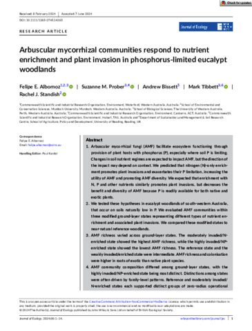Albornoz, F. E. orcid id iconORCID: https://orcid.org/0000-0001-9526-0945, Prober, S. M. orcid id iconORCID: https://orcid.org/0000-0002-6518-239X, Bissett, A., Tibbett, M. orcid id iconORCID: https://orcid.org/0000-0003-0143-2190 and Standish, R. J. orcid id iconORCID: https://orcid.org/0000-0001-8118-1904 (2024) Arbuscular mycorrhizal communities respond to nutrient enrichment and plant invasion in phosphorus‐limited eucalypt woodlands. Journal of Ecology, 112 (8). pp. 1842-1855. ISSN 1365-2745 doi: 10.1111/1365-2745.14365
