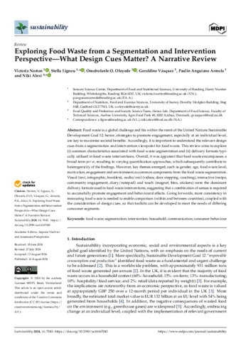 settingsOrder Article Reprints Open AccessReview Exploring Food Waste from a Segmentation and Intervention Perspective—What Design Cues Matter? A Narrative Review by Victoria Norton 1ORCID,Stella Lignou 1,*ORCID,Omobolanle O. Oloyede 2ORCID,Geraldine Vásquez 3,Paulina Anguiano Arreola 1 andNiki Alexi 3,*ORCID 1 Sensory Science Centre, Department of Food and Nutritional Sciences, University of Reading, Harry Nursten Building, Whiteknights, Reading RG6 6DZ, UK 2 Department of Nutrition, Food and Exercise Sciences, University of Surrey, Dorothy Hodgkin Building, Stag Hill, Guilford GU2 7XH, UK 3 Food Quality and Preference and Society Science Team, iSense Lab, Department of Food Science, Faculty of Technical Sciences, Aarhus University, Agro Food Park 48, 8200 Aarhus, Denmark * Authors to whom correspondence should be addressed. Sustainability 2024, 16(16), 7043; https://doi.org/10.3390/su16167043 Submission received: 18 June 2024 / Revised: 27 July 2024 / Accepted: 13 August 2024 / Published: 16 August 2024 (This article belongs to the Special Issue Sustainable Food Marketing, Consumer Behavior and Lifestyles) Downloadkeyboard_arrow_down Browse Figure Versions Notes Article Views443 Abstract Food waste is a global challenge and fits within the remit of the United Nations Sustainable Development Goal 12; hence, strategies to promote engagement, especially at an individual level, are key to maximise societal benefits. Accordingly, it is important to understand the relevant design cues from a segmentation and intervention viewpoint for food waste. This review aims to explore (i) common characteristics associated with food waste segmentation and (ii) delivery formats typically utilised in food waste interventions. Overall, it was apparent that food waste encompasses a broad term per se, resulting in varying quantification approaches, which subsequently contribute to heterogenicity of the findings. However, key themes emerged, such as gender, age, food waste level, motivation, engagement and environment as common components from the food waste segmentation. Visual (text, infographic, booklets), audio/oral (videos, door stepping, coaching), interactive (recipe, community engagement, diary/notepad) and touch (magnet, bins, stickers) were the dominant delivery formats used in food waste interventions; suggesting that a combination of senses is required to successfully promote engagement and behavioural effects. Going forwards, more consistency in measuring food waste is needed to enable comparison (within and between countries), coupled with the consideration of design cues, so that toolkits can be developed to meet the needs of differing consumer segments.