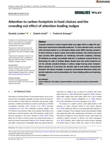 Lemken, D., Asioli, D. orcid id iconORCID: https://orcid.org/0000-0003-2274-8450 and Schoppa, F. (2024) Attention to carbon footprints in food choices and the crowding out effect of attention-leading nudges. Business Strategy and the Environment, 33 (8). pp. 8493-8507. ISSN 0964-4733 doi: 10.1002/bse.3916