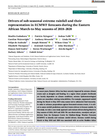 Gudoshava, M., Nyinguro, P., Talib, J., Wainwright, C., Mwanthi, A., Hirons, L. orcid id iconORCID: https://orcid.org/0000-0002-1189-7576, de Andrade, F., Mutemi, J., Gitau, W., Thompson, E., Gacheru, J., Marsham, J., Endris, H. S., Woolnough, S. orcid id iconORCID: https://orcid.org/0000-0003-0500-8514, Segele, Z., Atheru, Z. and Artan, G. (2024) Drivers of sub-seasonal extreme rainfall and their representation in ECMWF forecasts during the Eastern African March-to-May seasons of 2018 to 2020. Meteorological Applications, 31 (5). e70000. ISSN 1469-8080 doi: 10.1002/met.70000