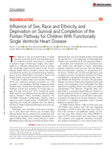 Influence of sex, race and ethnicity, and deprivation on survival and completion of the Fontan pathway for children with functionally single ventricle heart disease.