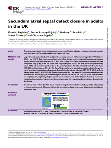 Aims To examine determinants of access to treatment, outcomes, and hospital utilization in patients undergoing secundum atrial septal defect (ASD) closure in adulthood in England and Wales. Methods and results Large retrospective cohort study of all adult patients undergoing secundum ASD closures in England and Wales between 2000/01 and 2016/17. Data were from population-based official data sets covering congenital heart disease procedures, hospital episodes, and death registries. Out of 6541 index closures, 79.4% were transcatheter [median age 47 years, interquartile range (IQR) 34–61] and 20.6% were surgical (40 years, 28–52). The study cohort was predominantly female (66%), with socioethnic profile similar to the general population. Mortality in hospital was 0.2% and at 1 year 1.0% [95% confidence interval (CI) 0.8–1.2%]. Risk of death was lower for transcatheter repairs, adjusting for age, sex, year of procedure, comorbidities, and cardiac risk factors [in-hospital adjusted odds ratio 0.09, 95% CI 0.02–0.46; 1-year adjusted hazard ratio 0.5, 95% CI 0.3–0.9]. There was excess mortality 1 year after ASD closure compared with matched population data. Median (IQR) peri-procedural length of stay was 1.8 (1.4–2.5) and 7.3 (6.2–9.2) days for transcatheter and surgical closures, respectively. Hospital resource use for cardiac reasons started the year before repair (median two inpatient and two outpatient-only days) and decreased post-repair (zero inpatient and one outpatient days during the first 2 years). Conclusion This national study confirms that ASD closure in adults, by surgical or transcatheter methods, is provided independently of ethnic or socioeconomic differences, it is low (but not no) risk, and appears to reduce future cardiac hospitalization even in older ages.