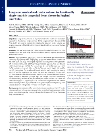 Brown, K. L., Huang, Q. orcid id iconORCID: https://orcid.org/0000-0003-4456-2999, Hadjicosta, E., Seale, A. N., Tsang, V., Anderson, D., Barron, D., Bellsham-Revell, H., Pagel, C., Crowe, S., Espuny Pujol, F. orcid id iconORCID: https://orcid.org/0000-0001-9085-7400, Franklin, R. and Ridout, D. (2023) Long-term survival and center volume for functionally single-ventricle congenital heart disease in England and Wales. The Journal of Thoracic and Cardiovascular Surgery, 166 (2). 306-316.e3. ISSN 0022-5223 doi: 10.1016/j.jtcvs.2022.11.018