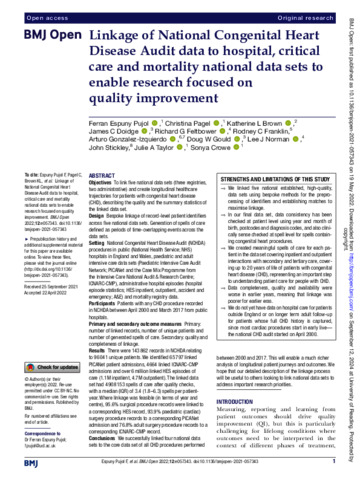 Espuny Pujol, F. orcid id iconORCID: https://orcid.org/0000-0001-9085-7400, Pagel, C., Brown, K. L., Doidge, J. C., Feltbower, R. G., Franklin, R. C., Gonzalez-Izquierdo, A., Gould, D. W., Norman, L. J., Stickley, J., Taylor, J. A. and Crowe, S. (2022) Linkage of national congenital heart disease audit data to hospital, critical care and mortality national data sets to enable research focused on quality improvement. BMJ Open, 12 (5). e057343. ISSN 2044-6055 doi: 10.1136/bmjopen-2021-057343