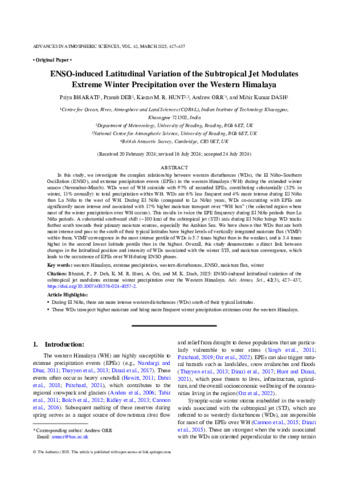 Bharati, P., Deb, P., Hunt, K. M. R. orcid id iconORCID: https://orcid.org/0000-0003-1480-3755, Orr, A. and Dash, M. K. (2025) ENSO-induced latitudinal variation of the subtropical jet modulates extreme winter precipitation over the Western Himalaya. Advances in Atmospheric Sciences, 42 (3). pp. 427-437. ISSN 1861-9533 doi: 10.1007/s00376-024-4057-2