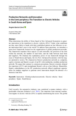 Garcia Calvo, A. orcid id iconORCID: https://orcid.org/0000-0001-8163-1637 (2024) Production networks and innovation in the semi-periphery: the transition to electric vehicles in South Korea and Spain. Studies in Comparative International Development. ISSN 0039-3606 doi: 10.1007/s12116-024-09436-0