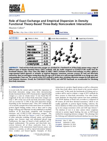 The role of exact exchange and empirical dispersion in Density Functional Theory-based three-body non-covalent interactions.