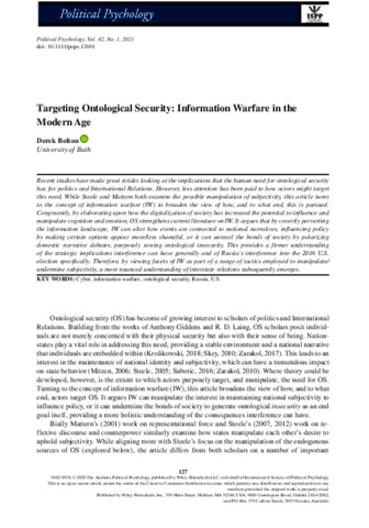Recent studies have made great strides looking at the implications that the human need for ontological security has for politics and International Relations. However, less attention has been paid to how actors might target this need. While Steele and Mattern both examine the possible manipulation of subjectivity, this article turns to the concept of information warfare (IW) to broaden the view of how, and to what end, this is pursued. Congruently, by elaborating upon how the digitalization of society has increased the potential to influence and manipulate cognition and emotion, OS strengthens current literature on IW. It argues that by covertly perverting the information landscape, IW can alter how events are connected to national narratives, influencing policy by making certain options appear more/less shameful, or it can unravel the bonds of society by polarizing domestic narrative debates, purposely sowing ontological insecurity. This provides a firmer understanding of the strategic implications interference can have generally and of Russia's interference into the 2016 U.S. election specifically. Therefore, by viewing facets of IW as part of a range of tactics employed to manipulate/undermine subjectivity, a more nuanced understanding of interstate relations subsequently emerges.
