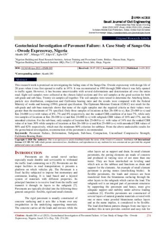 DO, A., VT, M., E, E. orcid id iconORCID: https://orcid.org/0000-0001-8509-5309 and GN, E. (2021) Geotechnical investigation of pavement failure: a case study of Sango Ota-Owode expressway,Nigeria. Saudi Journal of Civil Engineering, 5 (8). pp. 274-281. ISSN 2523-2231 doi: 10.36348/sjce.2021.v05i08.003