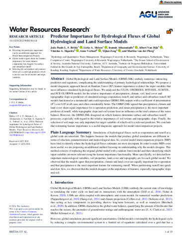 Brêda, J. P. L. F., Melsen, L. A., Athanasiadis, I., Van Dijk, A., Siqueira, V. A., Verhoef, A. orcid id iconORCID: https://orcid.org/0000-0002-9498-6696, Zeng, Y. and van der Ploeg, M. (2024) Predictor importance for hydrological fluxes of global hydrological and land surface models. Water Resources Research, 60 (9). e2023WR036418. ISSN 1944-7973 doi: 10.1029/2023WR036418